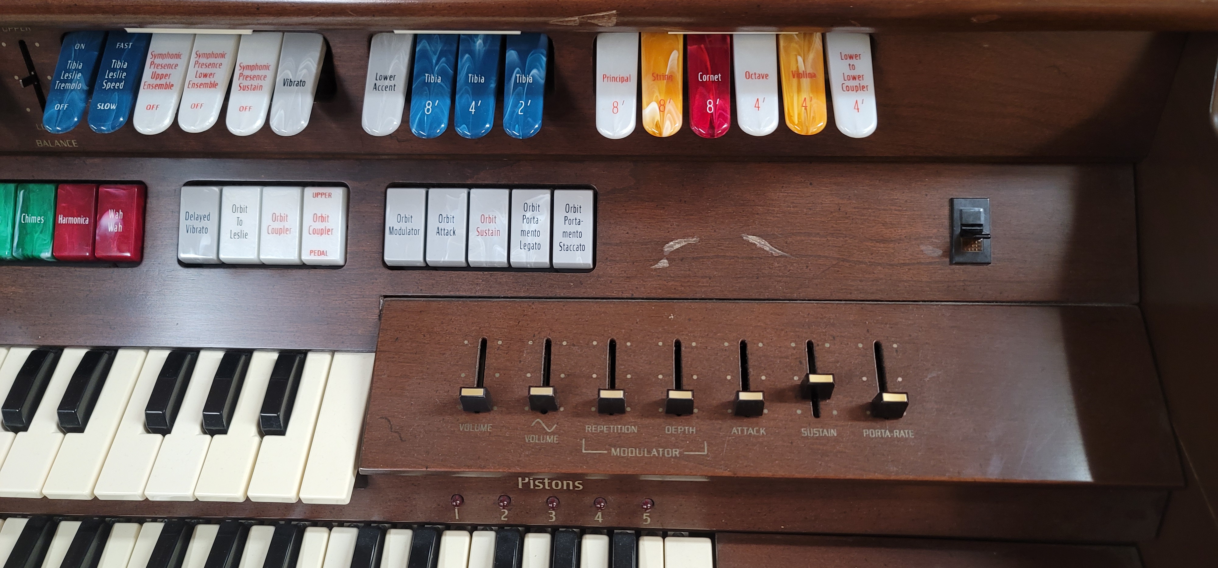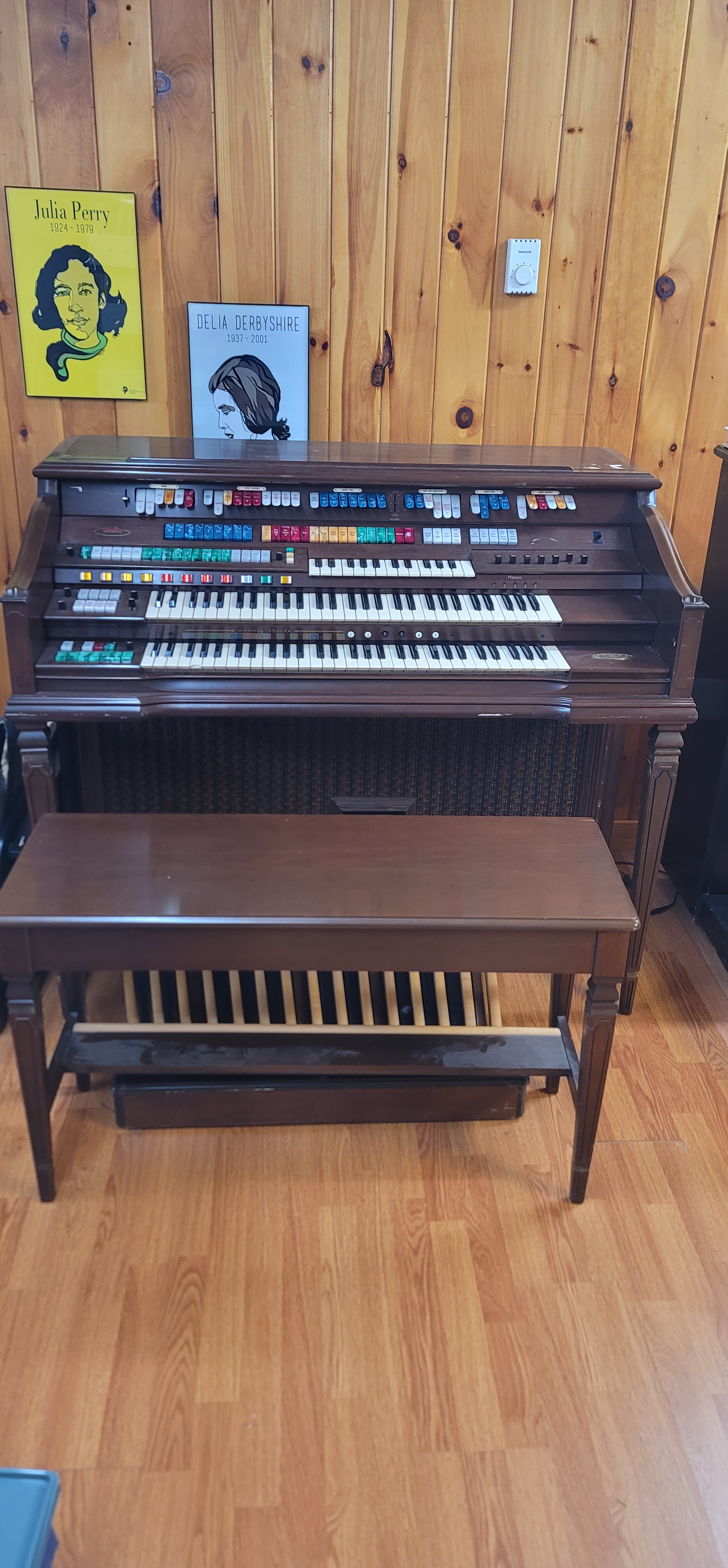 Organ – Wurlilzer – $40. Shipping and delivery are not available for this instrument. Works great for the most part. Sliders, instruments, pedals all work well, the sound is pretty good. You can only play one pedal note at a time – if two or more foot pedals are depressed, only the highest will sound. The music stand attachment is missing. Bottom set of keys: the end of the low G key is chipped but plays correctly. Middle set of keys: the low Eb is broken and the first 9 notes from low C to Ab do no work. The pedals do detach easily for better transport. I do not have the right vehicle, but I can assist with loading it into your vehicle.