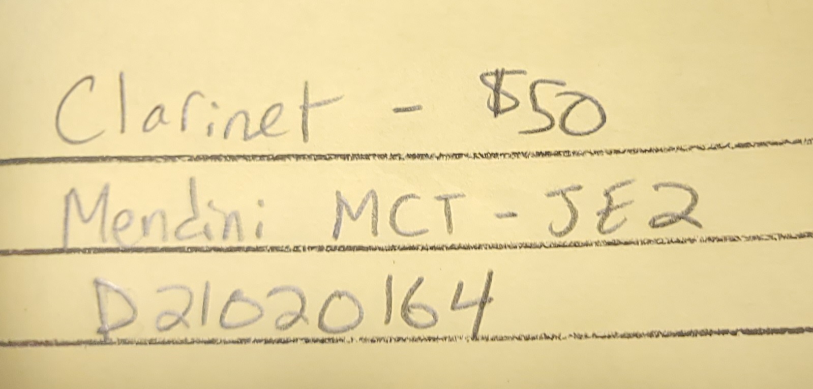 Clarinet – Mendini- $50. Comes in a sturdy, two-latch Artley hard case. Full keywork, comfortable thumb rest cushion, original mouthpiece with ligature and cap. Great clarinet for those on a budget.