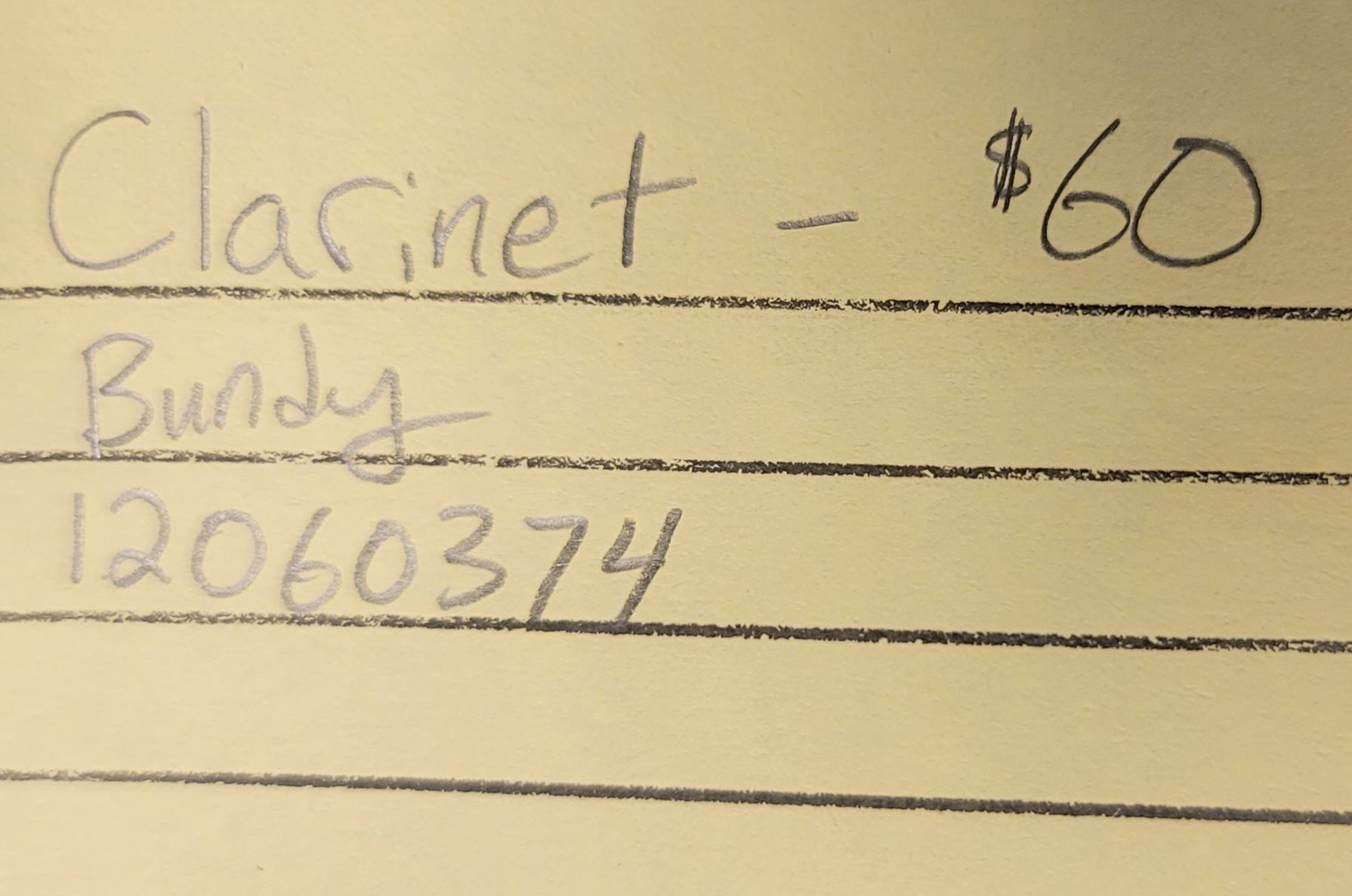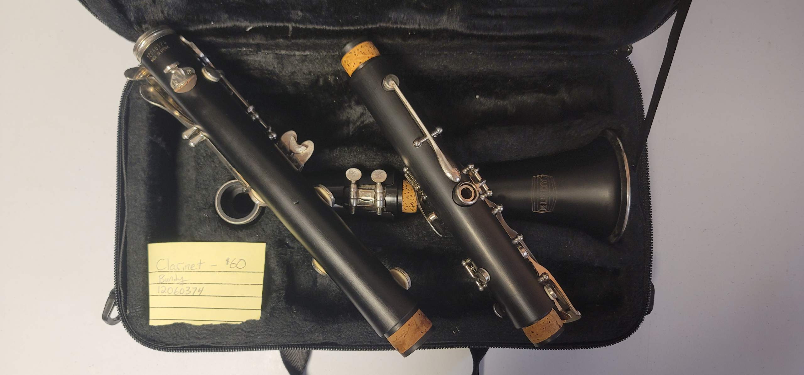 Clarinet – Bundy – $60. Comes with original mouthpiece and ligature. Comes in a zipper Verve case with storage pouch.