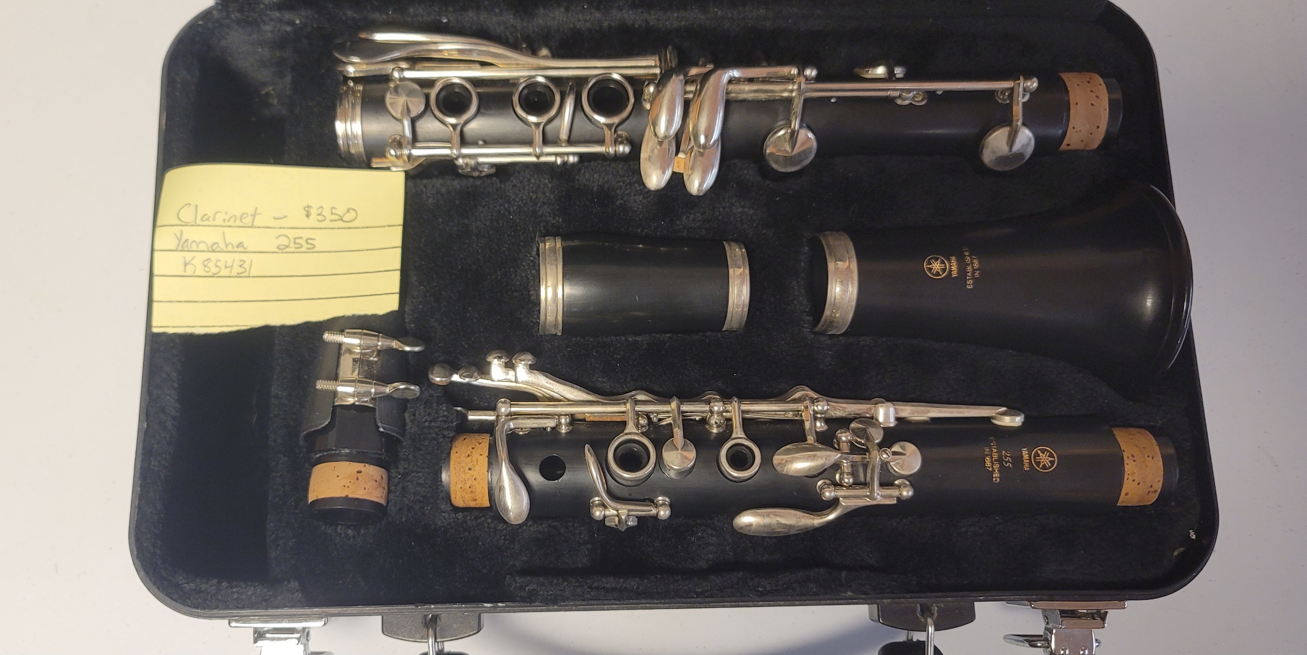 Clarinet – Yamaha 255 – $350. An excellent plastic step-up clarinet with a great sound, comfortable adjustable thumb rest, original mouthpiece, and it’s excellent, sturdy, & lightweight original case.